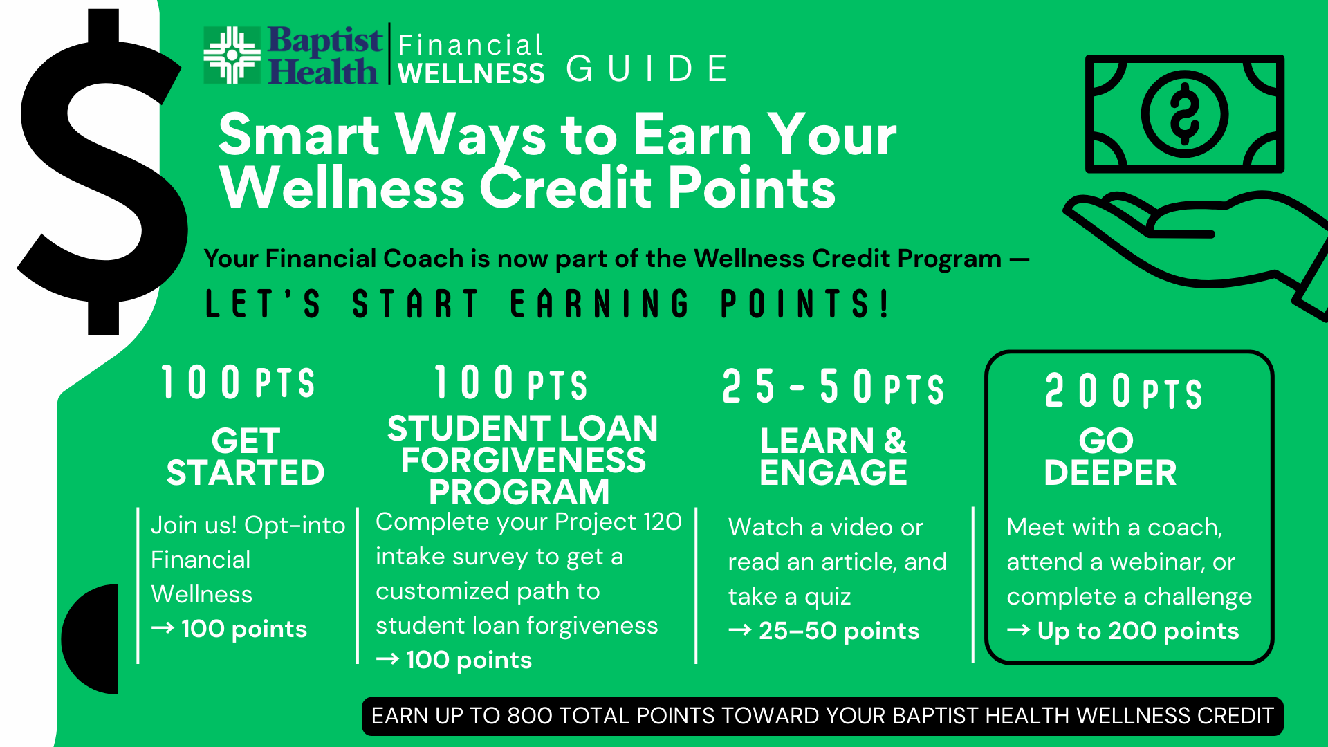 You can earn up to 800 points toward your Wellness Credit by participating in the Baptist Health Financial Wellness program. Below is a list of ways you can earn points. Each month, we will be posting different resources here - webinars, videos, blogs, etc., and a quiz to capture your points. We’ll keep in touch with you via email and text about what points are available to you each month. Don’t miss out on your opportunities!